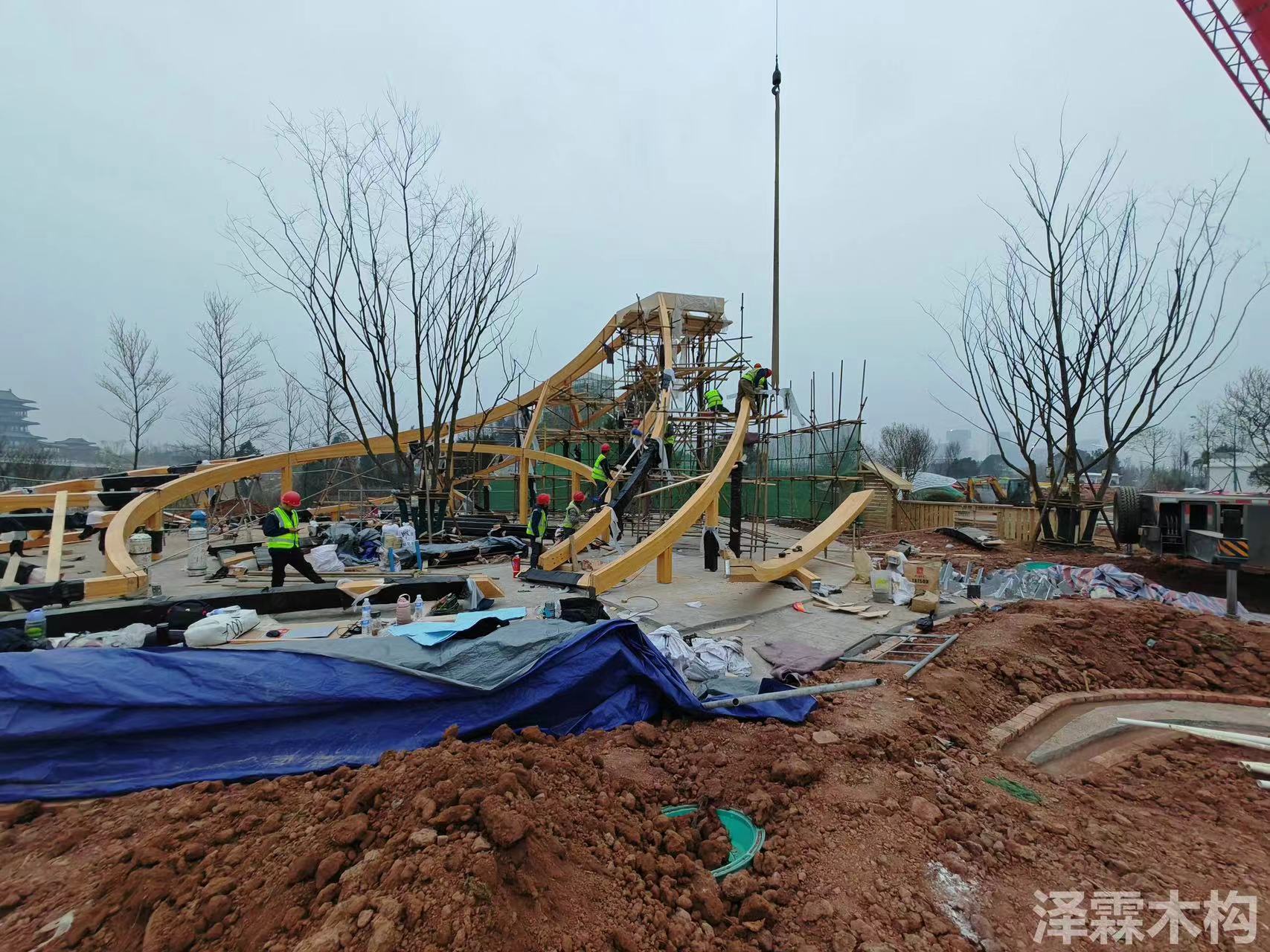 我司四川泽霖木结构工程有限公司:作为行业的领军者,专注于创新和可持续的建筑解决方案。在本项目中,我们负责装配式木结构和钢木结构的施工,展现了公司在实现复杂设计方案中的专业技能和高效执行力。